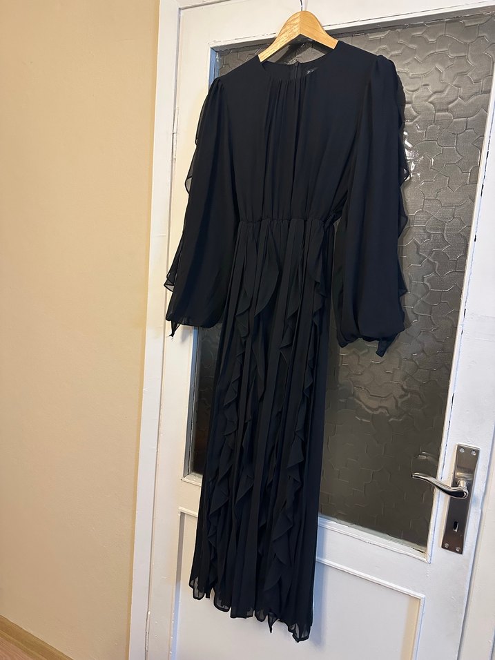 Uzun siyah elbise, yüksek yakalı ve bol kesimdir. Keten kumaştan, drapeli ve askılı kolludur. Gotik tarzda, ofis için uygundur. Bir kere gitdim