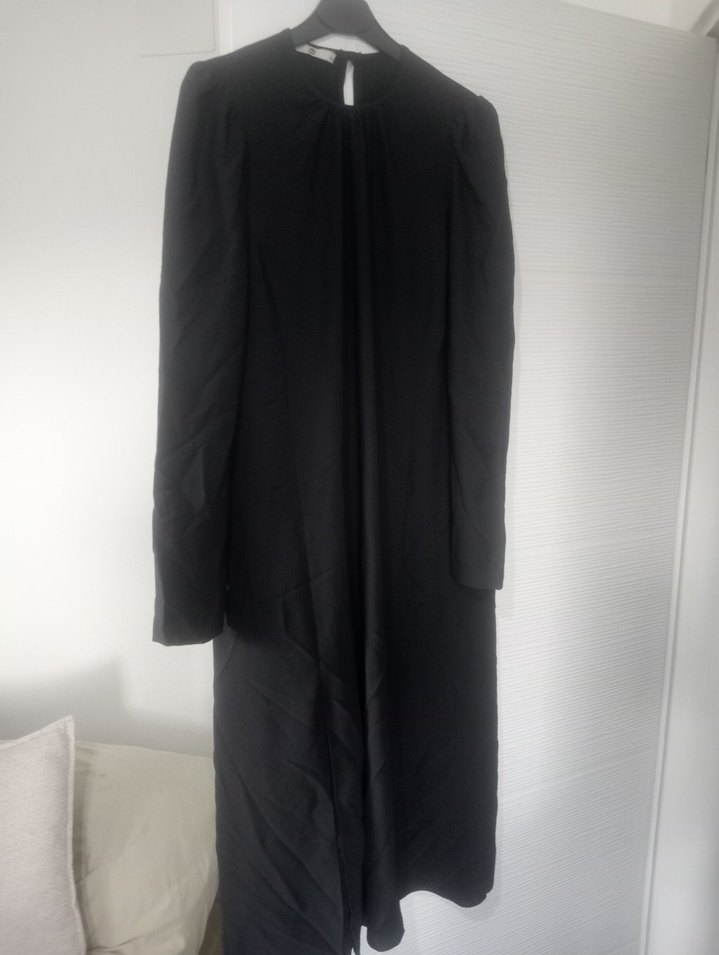 Yüksek yakalı, uzun kollu ve drapeli tasarımlı siyah uzun elbise. İpeksi kumaştan yapılmış, ofis kullanımı için uygun regular fit model.omuz ve yakalar robalı önden çift yırtmaç sıfırdır tek kalan ürünler.tek alım yokdur bu fiyata kargoya gitme param bile diğil.iyade yokdur boy 116 bel 50.kol 64cmdir