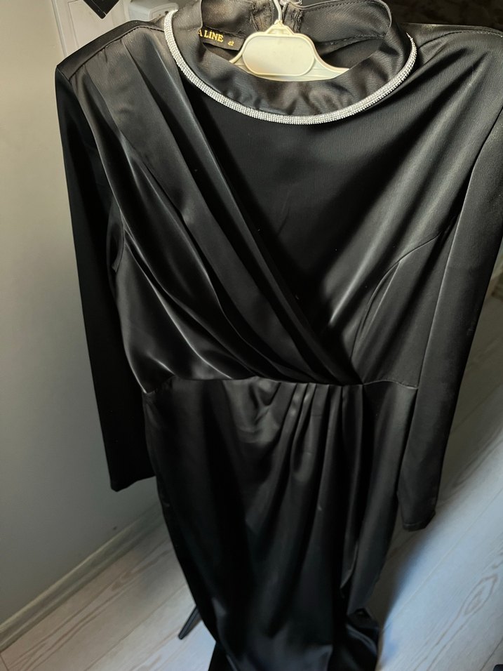 Parlak kumaştan, uzun kollu ve drapeli, dar kesim siyah uzun kadın elbisesi. Yuvarlak yaka ve desen içermeyen şık tasarım, avant-garde moda için uygundur. ✨