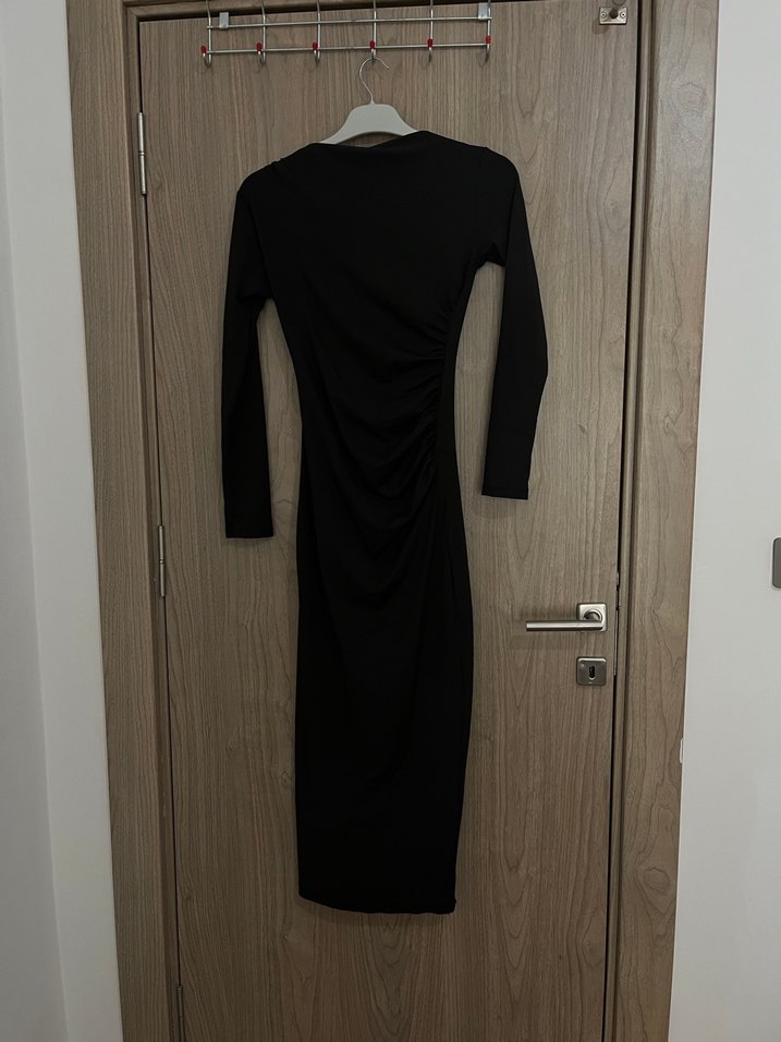 Uzun siyah elbise, drapeli detaylara sahiptir. Yumuşak sentetik kumaştan, uzun kolludur, romantik akşamlar için uygundur.