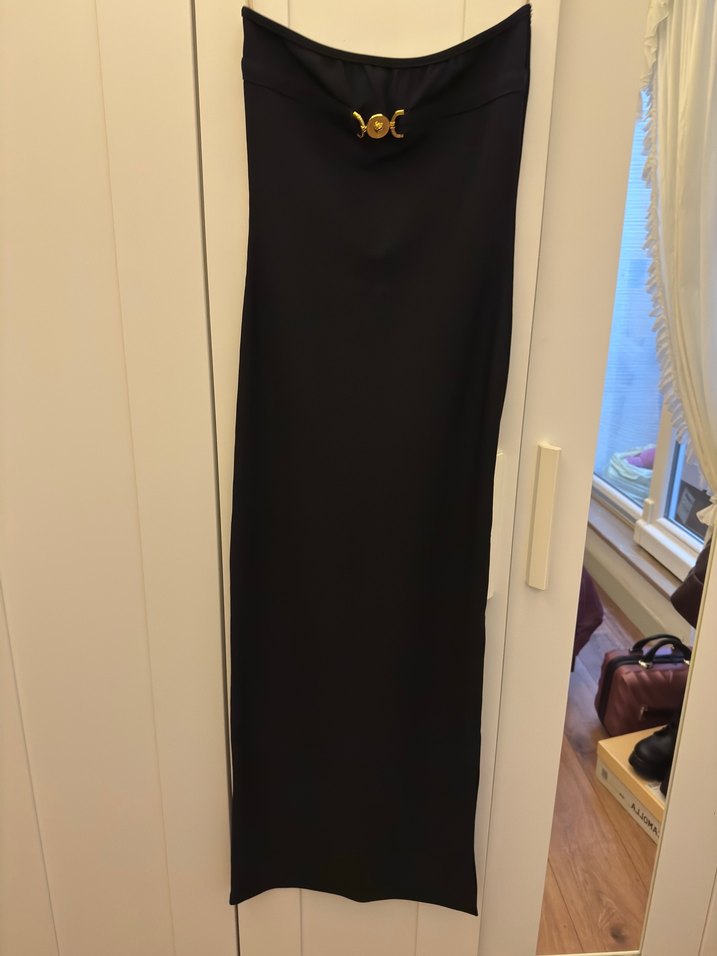 Hiç giyilmedi Bu uzun siyah etek, drapeli detayı ve ipeksi dokusuyla minimalist goth tarzında şık bir ofis görünümü sunar.