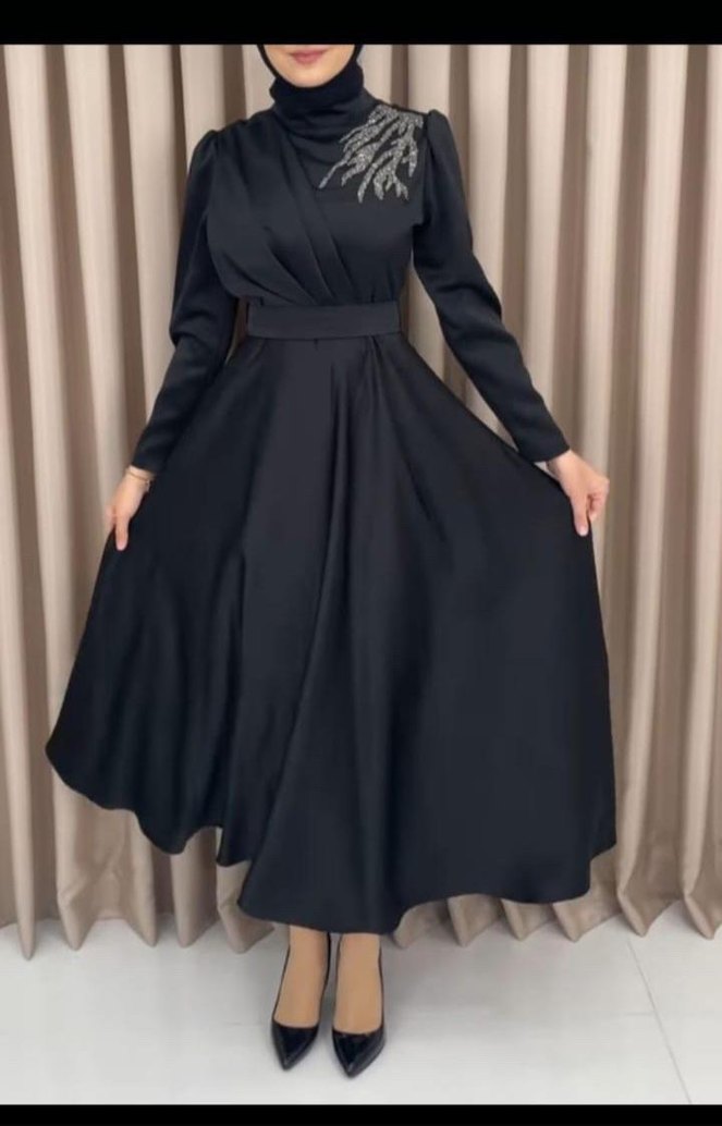 Uzun siyah elbise, yüksek yakalı ve uzun kollu, drapeli tasarıma sahip. Düzenli kesim ve göz alıcı 40 42 beden uyumlu