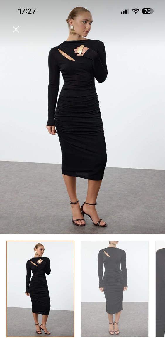 Uzun siyah kalem elbise, vücuda oturan kesim ve drapeli detaylara sahiptir. Tekne yaka ve ince askılı kolludur, yumuşak sentetik kumaştan yapılmıştır.