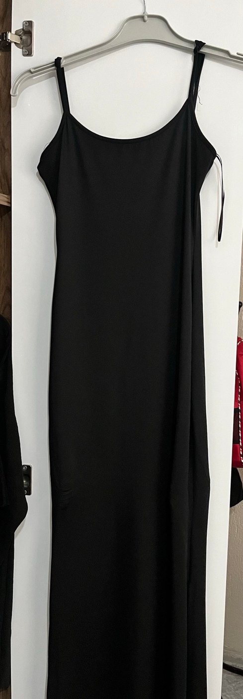 Drapeli uzun siyah elbise, kolsuz ve tek renk. Tekstil sentetik kumaştan, minimal goth tarzında, ofis için uygundur.