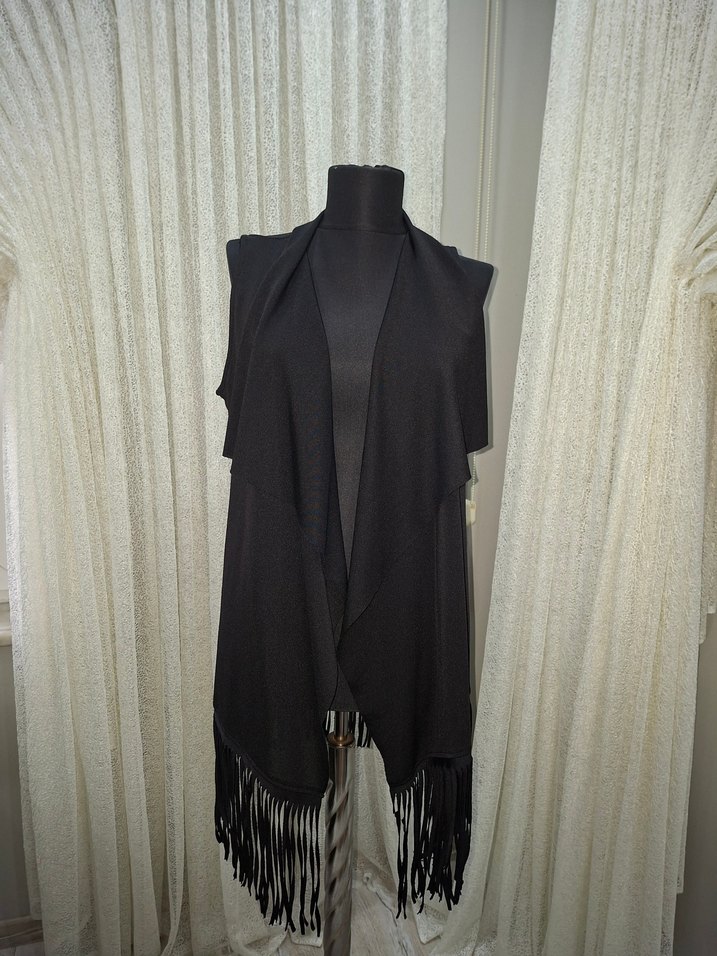 Yüksek yakalı, uzun ve kolsuz siyah yelek. Drapeli ve salaş kesimli, püsküllü detaylarla bohem ve goth tarzına uygun.