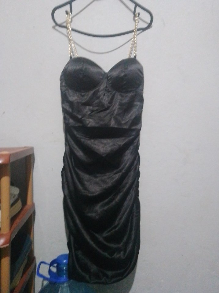 Bu uzun, vücuda oturan gece elbisesi, straplez yakaya ve parlak siyah kumaşa sahiptir. Zincir görünümlü ince askıları ve drapeli detayları ile gotik parti stili için uygundur.