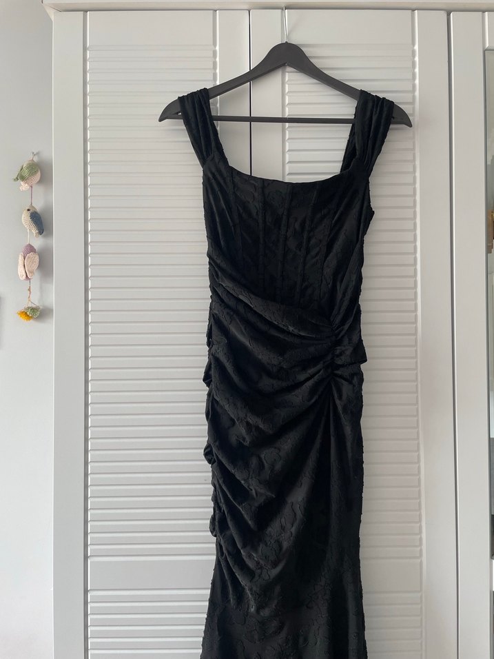 Bu dar kesim siyah gece elbisesi, drapeli detaylara sahiptir.