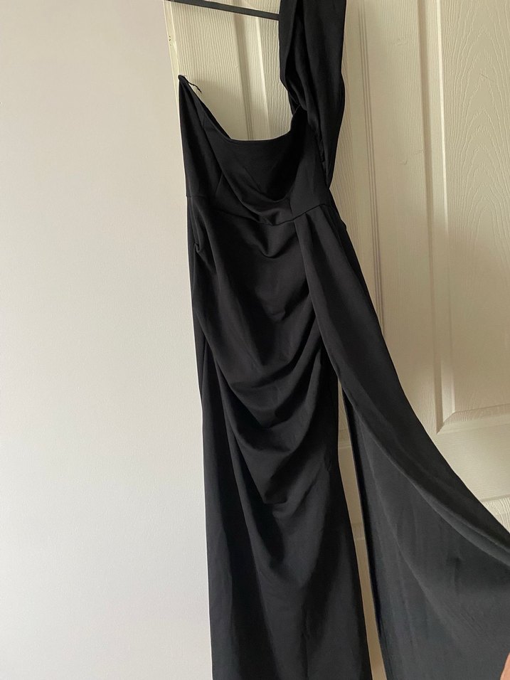 Drapeli ve straplez yakalı, uzun ve vücuda oturan siyah elbise. İnce askılı ve desen içermeyen tasarımıyla romantik akşamlar için ideal.