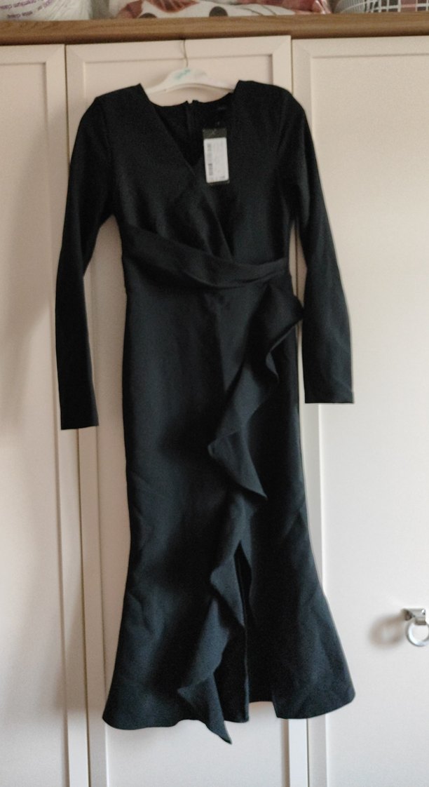 V yaka ve drapeli detaylara sahip, uzun ve siyah renkte, fitted kesimli bu elbise gotik ve avangart stile uygun, ofis kullanımı için ideal.