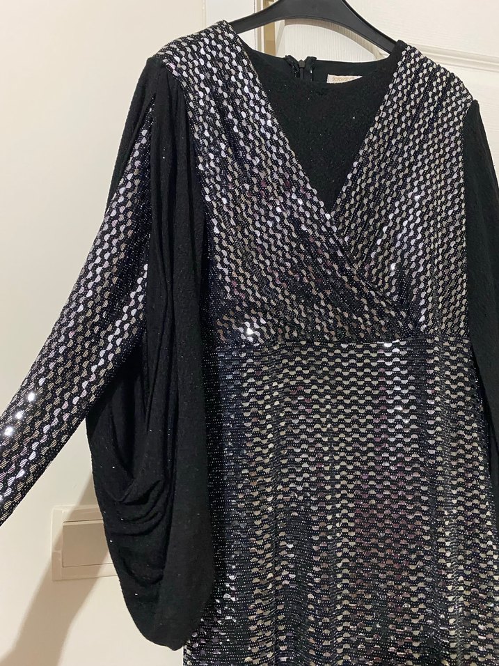 Uzun siyah elbise, drapeli ve bol kesimdir. V yaka, uzun kollu ve desenlidir. Gotik tarzda, parti için uygundur.