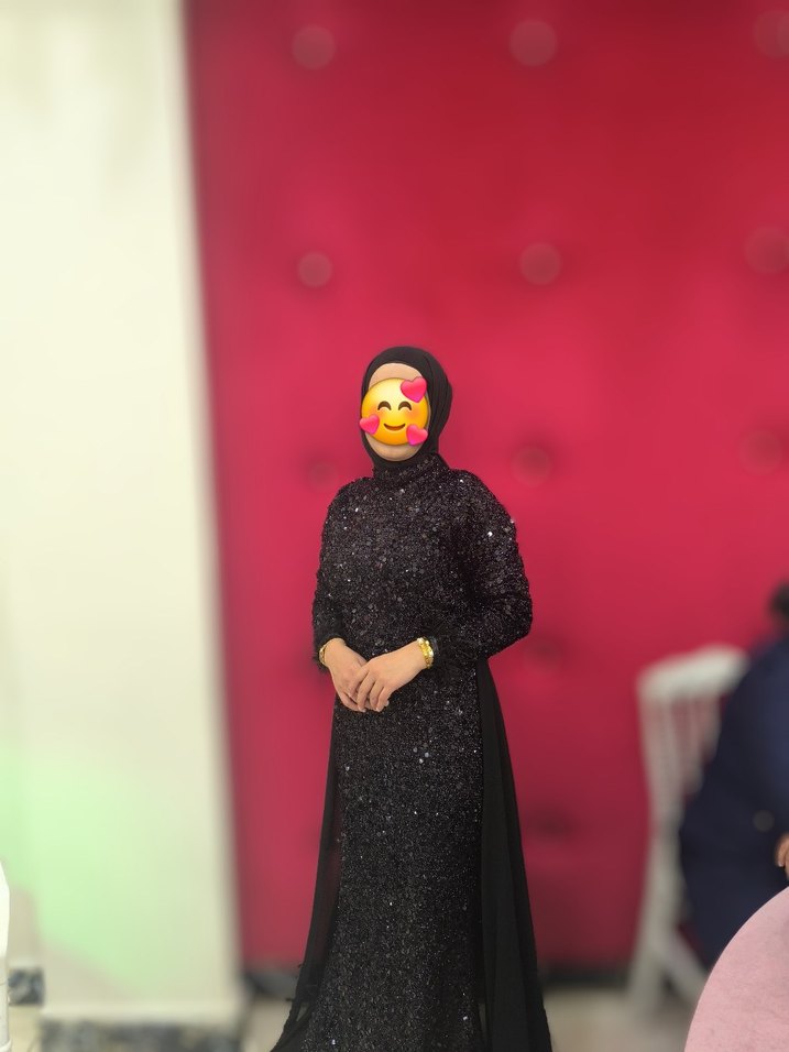 Drapeli uzun siyah abiye elbise, yüksek yakalı ve uzun kolludur. Koyu renk, desenli ve vücuda oturan tasarımıyla göz alıcıdır.