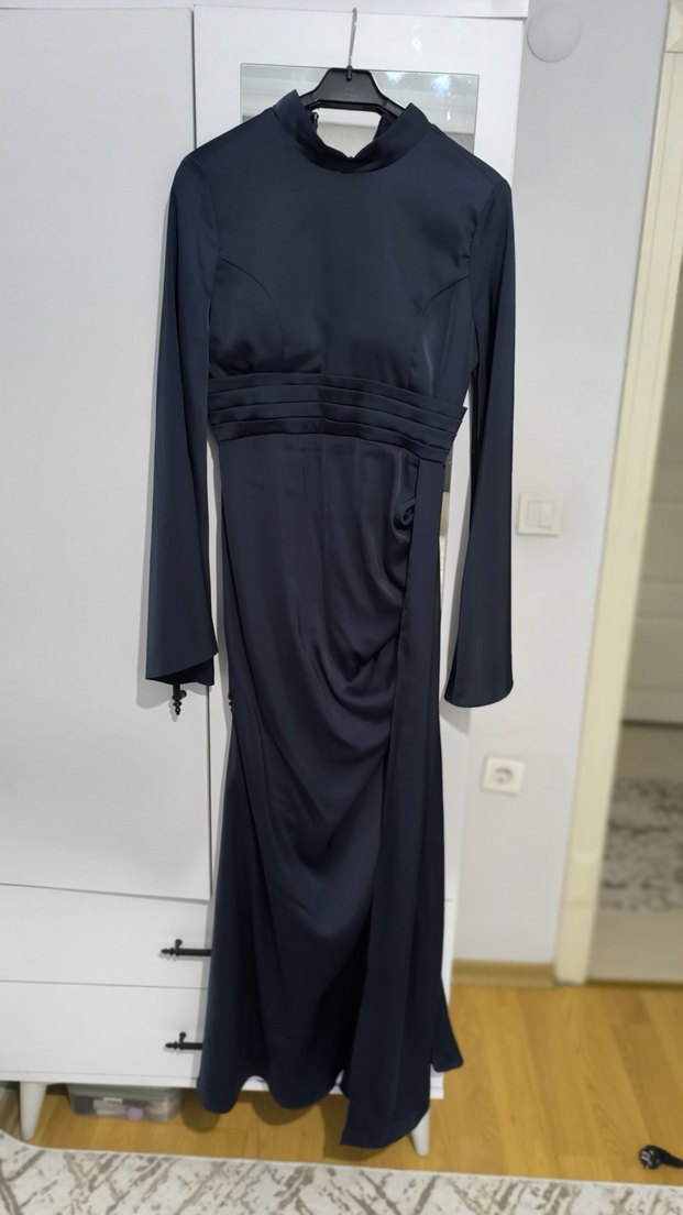 Uzun kollu, yüksek yakalı ve drapeli ipeksi kumaştan yapılmış, lacivert ve vücuda oturan bu elbise ofiste avant-garde tarzı için uygun. Hiç giyilmedi, bedeni olmadığı için satıyorum.