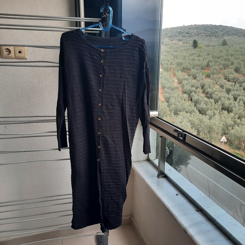 Uzun, bol kesim siyah hırkas, düğmeli ve tek renk. Keten kumaştan, uzun kollu ve kayık yakalı, günlük kullanım için uygun.