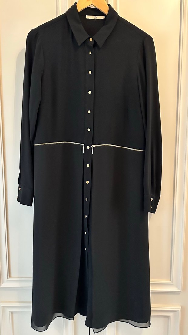 Uzun siyah elbise, ipeksi kumaş, uzun kollu ve düğmeli ön detaylıdır. Klasik tunik gömlek.