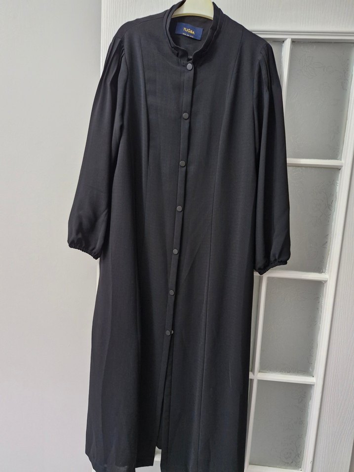 Kadınlar için uzun siyah ferace yüksek yakalı ve düğmeli kapamalı. Sentetik kumaştan, bol kesim ve uzun kollu, tesettüre uygun dış giyim