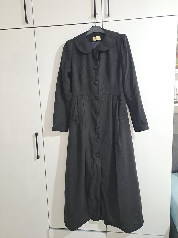 Bu uzun siyah kadın kabanı, düğmeli ön kısmı ve yuvarlak yakası ile dikkat çeker. Keten kumaştan yapılmış, regular fit ve uzun kolludur, gotik tarzda ve ofise uygun.