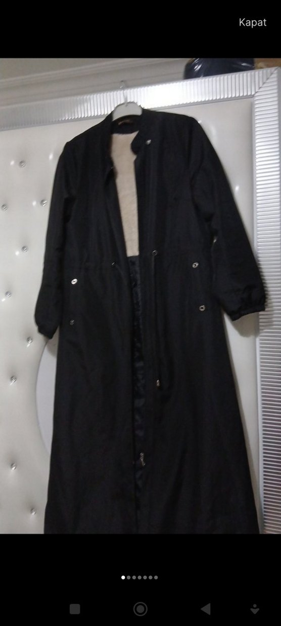 Uzun siyah kadın palto, düğmeli ve kesik yakalıdır. Gevşek kesim, uzun kollu ve sentetik kumaştan yapılmıştır. Desensiz, gotik ve Paris tarzı bir tasarıma sahiptir. omuzdan aşağıya uzunluk 136 cm iki koltuk arası 57 cm