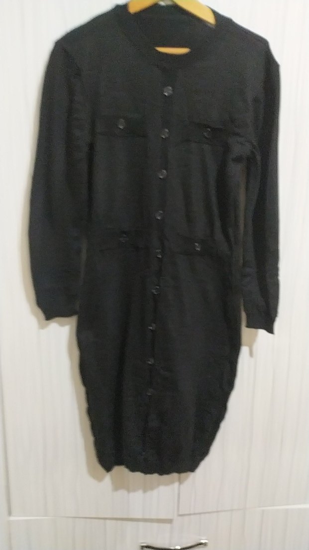 Uzun, düğmeli ve uzun kollu kadın triko elbise. siyah renkte ve keskin yakalı, gotik tarzda şık bir tasarım.
