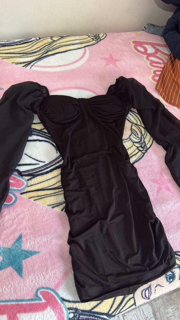Bu siyah dar kesim gece elbisesi, uzun drapeli kollar ve V yaka ile cesur gotik parti görünümü sunar. Uzun ve desensizdir, koyu tarzı vurgular.