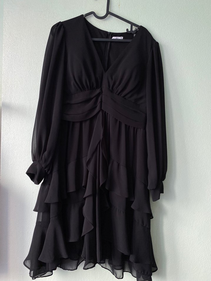 Fırfır detaylı, V yakalı, siyah elbise. Uzun kollu parti için uygun.