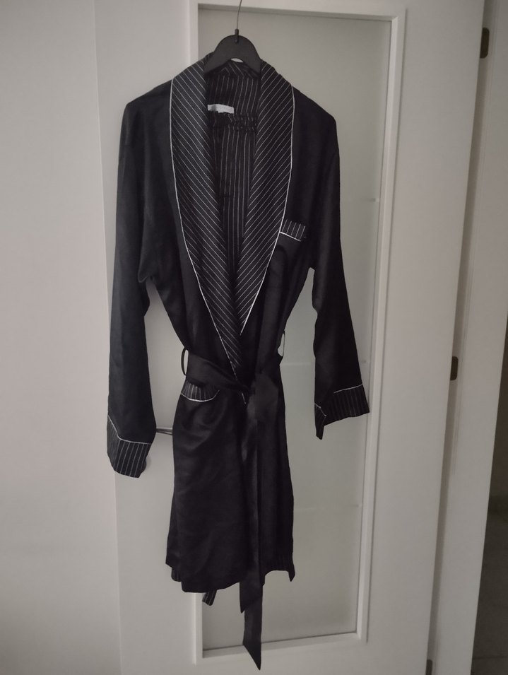 Uzun siyah alt pijaması ve sabahlık Yaka ve manşetlerde ince çizgili detaylar bulunur. Saten ve yumuşak kumaşlıdır. az giyildi hiçbir sorunu yoktur