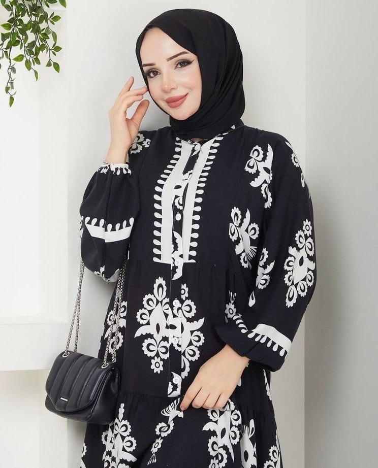 Uzun siyah etnik desenli elbise, yüksek yakalı ve uzun kolludur. Salaş kesimi ve püskül detaylarıyla sentetik kumaştandır.