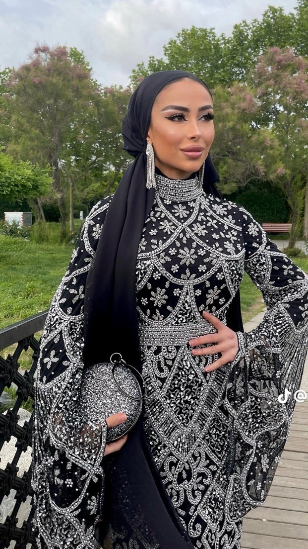 Fitted uzun siyah abiye elbise, etnik desenler, yüksek yakalı ve drapeli uzun kollu tasarımıyla düğünler için uygun.
