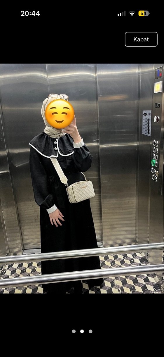 Yüksek yakalı, etnik desenli, bol kesim uzun siyah elbise. Uzun kollu ve kemerli, günlük kullanıma uygun mütevazı tarzda.