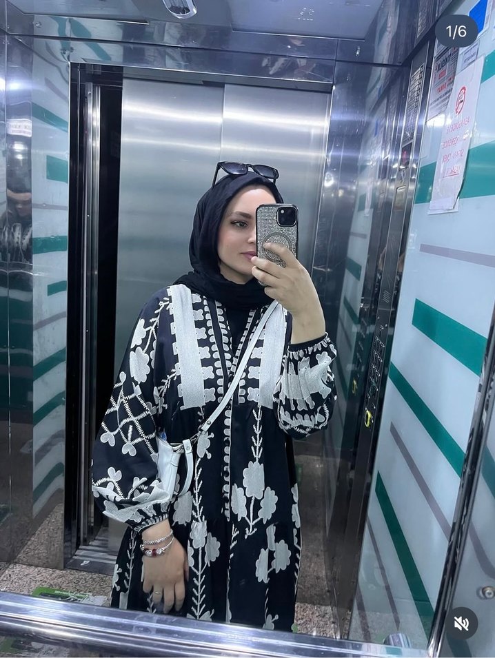 Uzun siyah elbise, etnik desenler, yüksek yaka ve uzun kollu. Bol kesim ve püsküllü, sentetik kumaştan, mütevazı sokak stili için uygun.