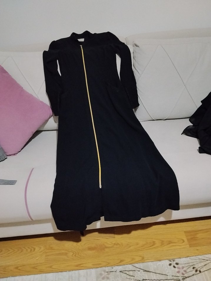Uzun, dar kesim kadın elbisesi, minimalist goth tarzında, uzun kollu ve ön fermuarlı. Düz siyah ve şık tasarıma sahiptir. ferace