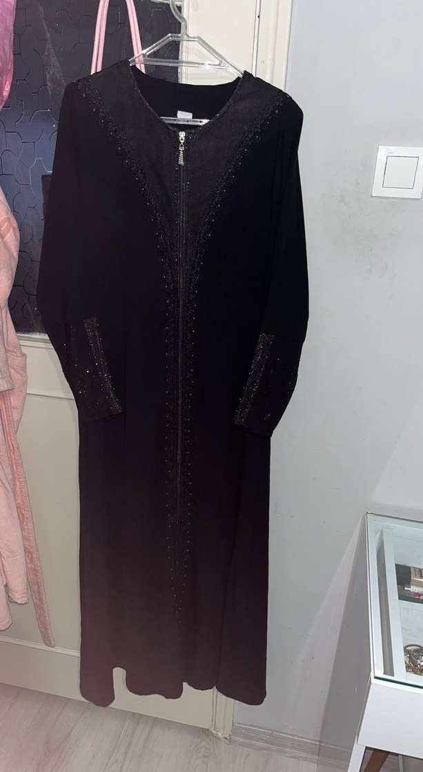 Uzun siyah renkte, fermuarlı ve uzun kollu ferace