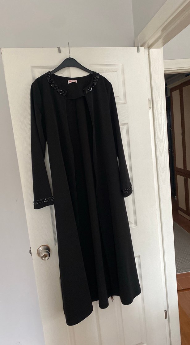 Siyah uzun kollu, modest kesim ve yakasında notched lapel detaylı, drapeli gotik tarzda kadın feraje ürün hiç kullanılmamıştır yandan cepleri vardır kol ve yaka detayında işlemeli taş işlemeleri vardır boyu 120 santimdir omuzda iki göğüs arası 48 santimdir ürün hiç kullanılmamıştır yırtığı söküğü lekesi hiçbir şey yoktur koyu siyah ve satensi bir kumaştan yapılmıştır