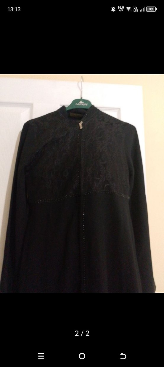 Uzun siyah kaban, yüksek yakalı ve uzun kolludur. Düzgün sentetik kumaştan yapılmış, fermuarlı ve hafif gotik detaylara sahiptir, ofis kullanımı için uygundur.