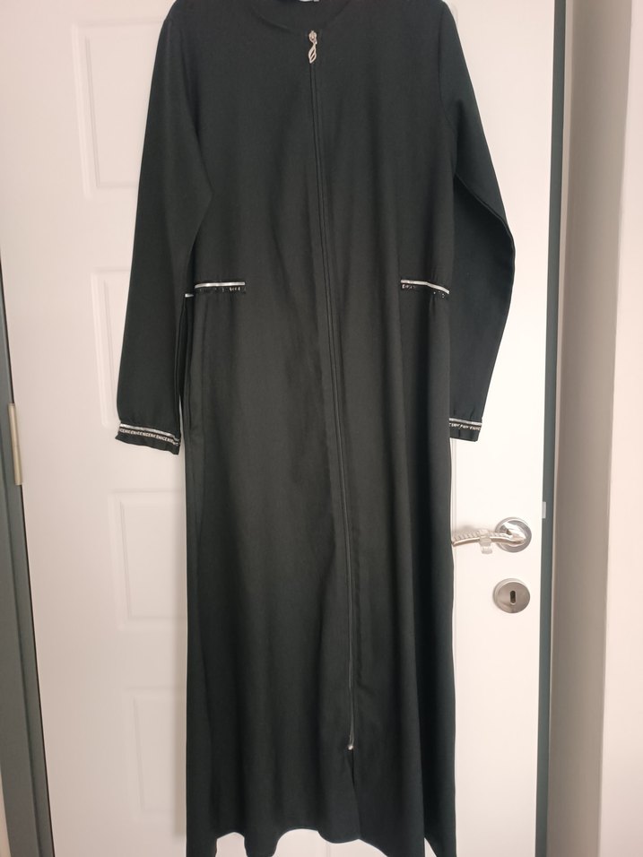 Yüksek yakalı ve uzun kollu, fermuarlı uzun siyah ferace. Düzenli kesim ve sade tasarıma sahip, günlük kullanıma uygundur. Tek taraflı cep mevcuttur fotoğraf da belirttim Beyaz yerlerin deki yazılar da hafif silinme vardır başkada hiç bir şey yoktur 36,38,40 bedenler için uygundur