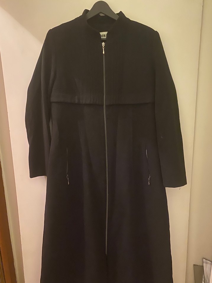 Uzun siyah kadın kaban, fermuarlı ön ve kesilmiş yaka detayına sahiptir. Yumuşak ve sıcak kumaştan, uzun kollu ve normal kesimdir. Ofis için uygundur.