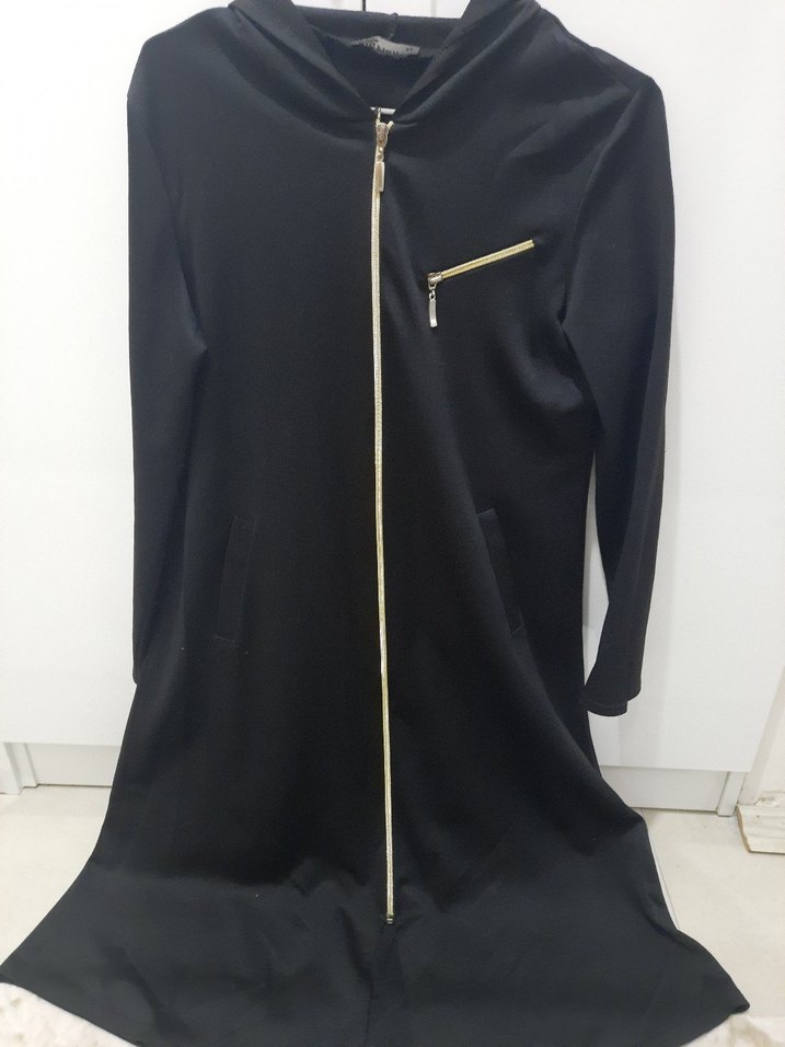 Uzun siyah kadın kaban, yüksek yakalı ve uzun kolludur. Regular kesim olup, ön ve göğüs kısmında fermuar detayları bulunur. Günlük sokak stili için uygundur. ince yazlık giy çık tarzı kullanilabilir