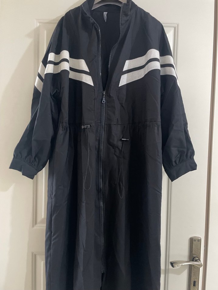 Yüksek yakalı, uzun kollu ve kollarında beyaz şeritler bulunan uzun siyah fermuarlı kadın yağmurluğu. Rahat kesimli ve sentetik kumaştan üretilmiştir. ️