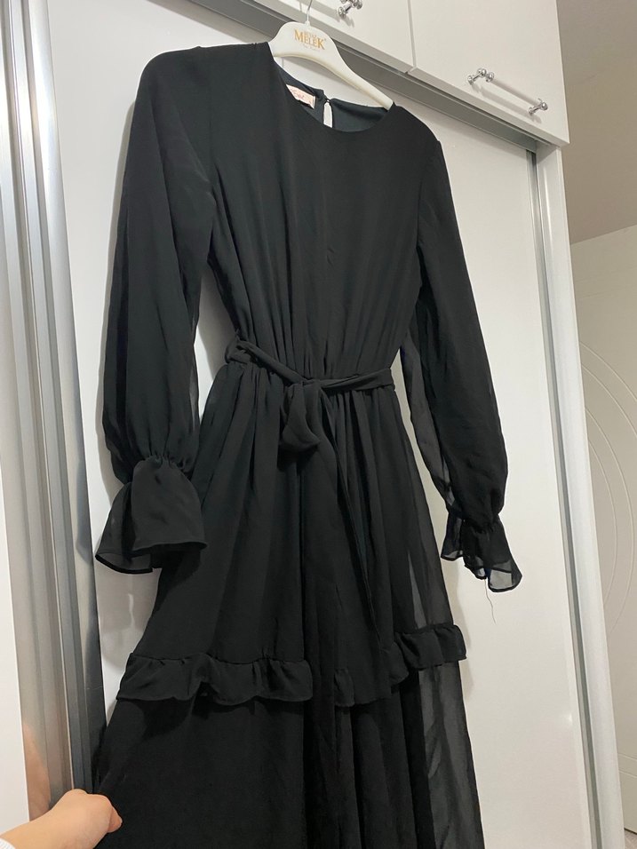 Uzun siyah elbise, bol kesim ve fırfır detaylara sahiptir. Yüksek yakalı, gotik tarzda ve askılı kolludur, ofis için şık ve avant-garde bir görünüm sunar.