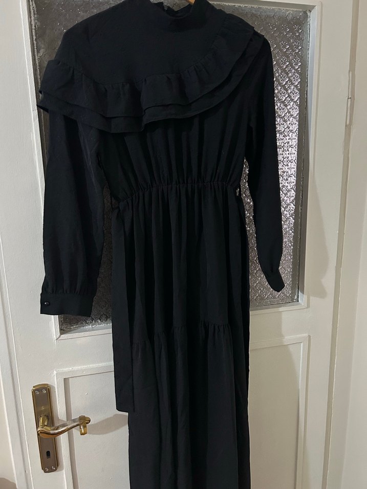 Uzun siyah elbise, yüksek yakalı ve fırfır detaylıdır. Uzun kollu, bol kesim ve kemerlidir.