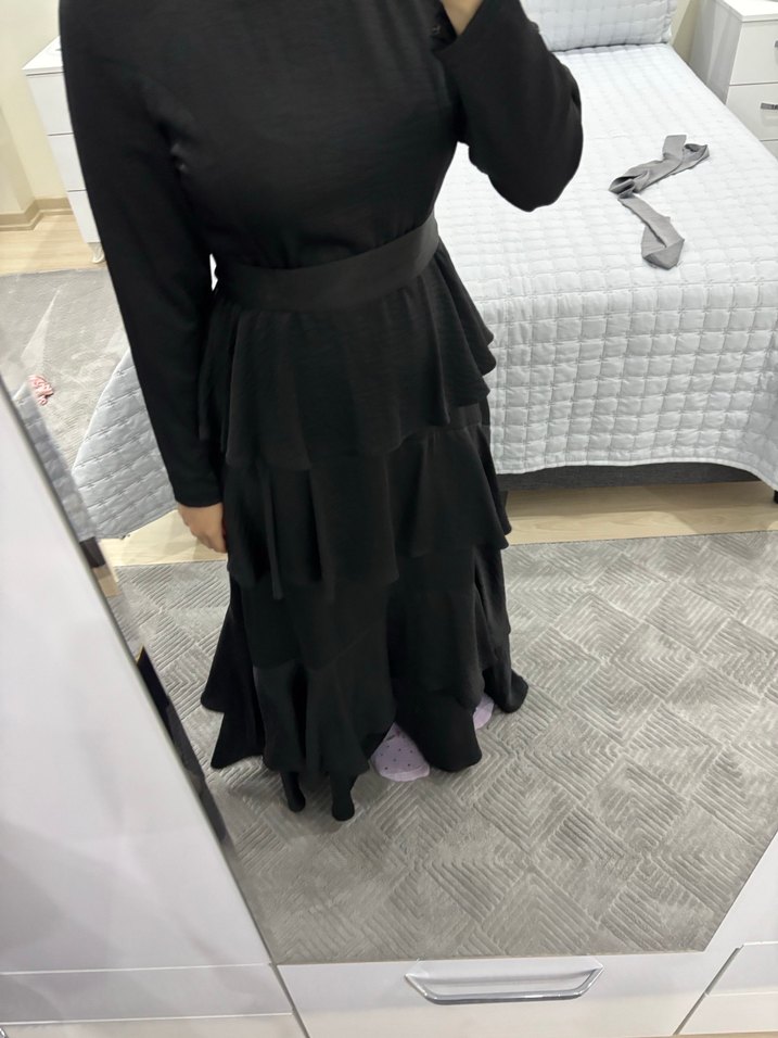 Uzun kol ve yüksek yakalı, kat kat fırfırlar içeren siyah, vücuda oturan gotik tarzda uzun elbise.