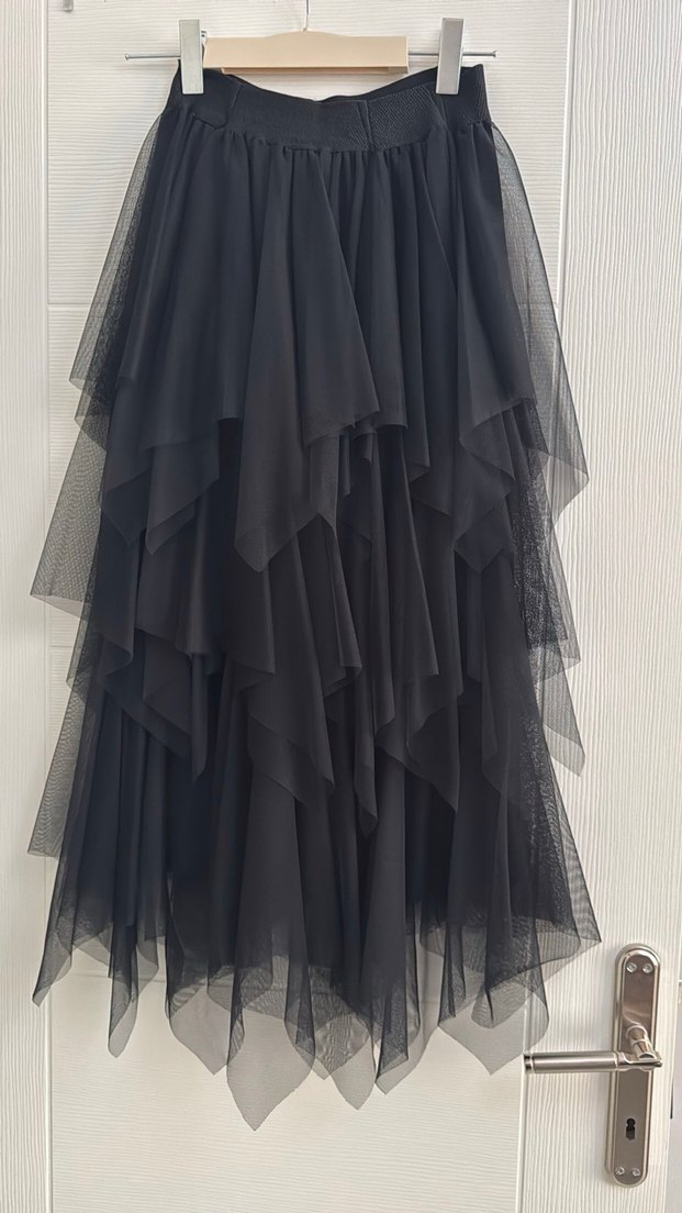 Yumuşak sentetik kumaştan, kat kat fırfırlı ve bol kesimli uzun siyah etek, gotik parti görünümü için ideal.
