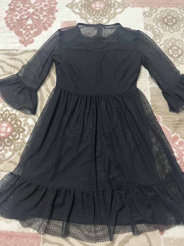 Uzun siyah elbise, fırfır detaylı ve bol kesimdir. Yuvarlak yaka ve askılı kolları yumuşak sentetik kumaştan yapılmıştır, parti için uygundur.