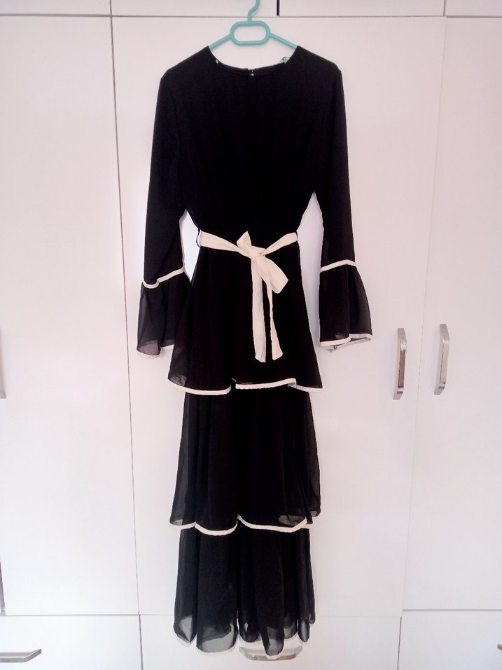 elbise uzundur. Herhangi bir deformesi yoktur. S bedendir. 1 kez giyilmiştir. Beli lastikli beyaz kusaklidir. Şifon kumaştır. Alt bölümü kat kat gelmektedir.