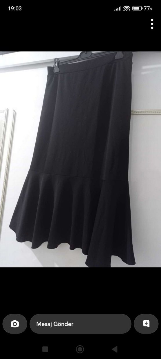 Uzun siyah etek, vücuda oturan kesim ve fırfırlı etek ucu ile dikkat çeker. Pürüzsüz sentetik kumaştan üretilmiş, minimalist gotik tarzda ve ofis kullanımı için uygundur.boy ölçüsünü bilmiyorum ben 1.57 yım midi boy oluyor