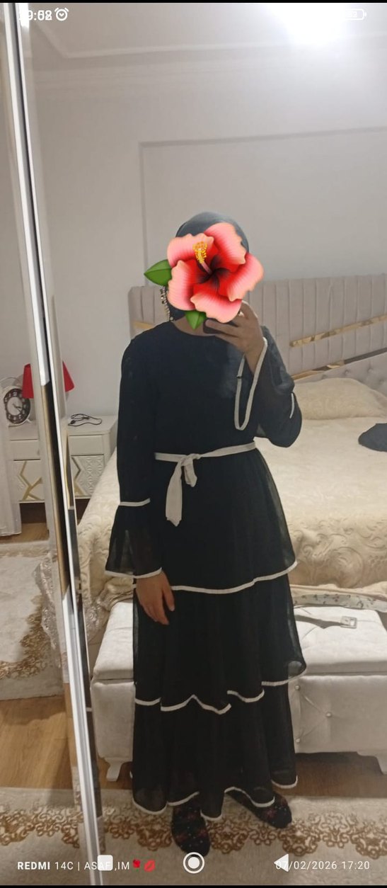 Uzun siyah elbise, fırfır detayları ve yüksek yakaya sahip. Bol kesim, askılı kollu ve işleme desenlidir. Beyaz kemerle ofis için uygun. kolunda birazcık yırtık var