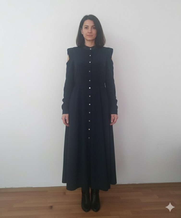 Uzun Siyah Goth Düğmeli Kadın Kaban