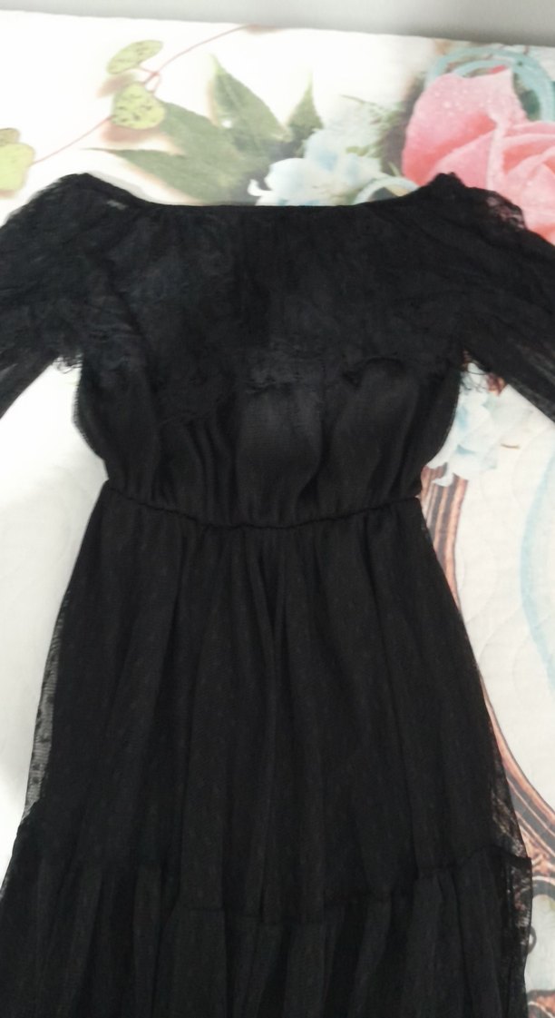 beli lastikli esnek siyah uzun elbise, tekne yaka ve fırfır detaylarına sahiptir. Sentetik kumaştan olup uzun kolludur, goth ve bohem tarzlar için uygundur.