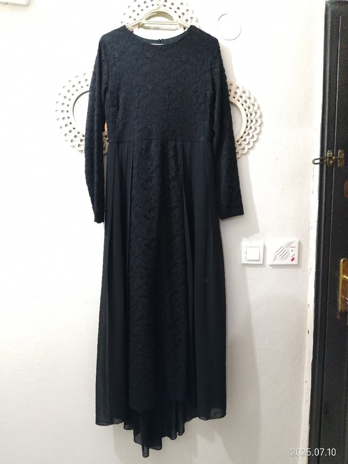 Uzun siyah dantelli, drapeli ve bol kesim uzun kollu, yuvarlak yakalı mütevazı goth elbise. Düz ve desensiz, özel davetlere uygun.40 42 44 bedene uygundur