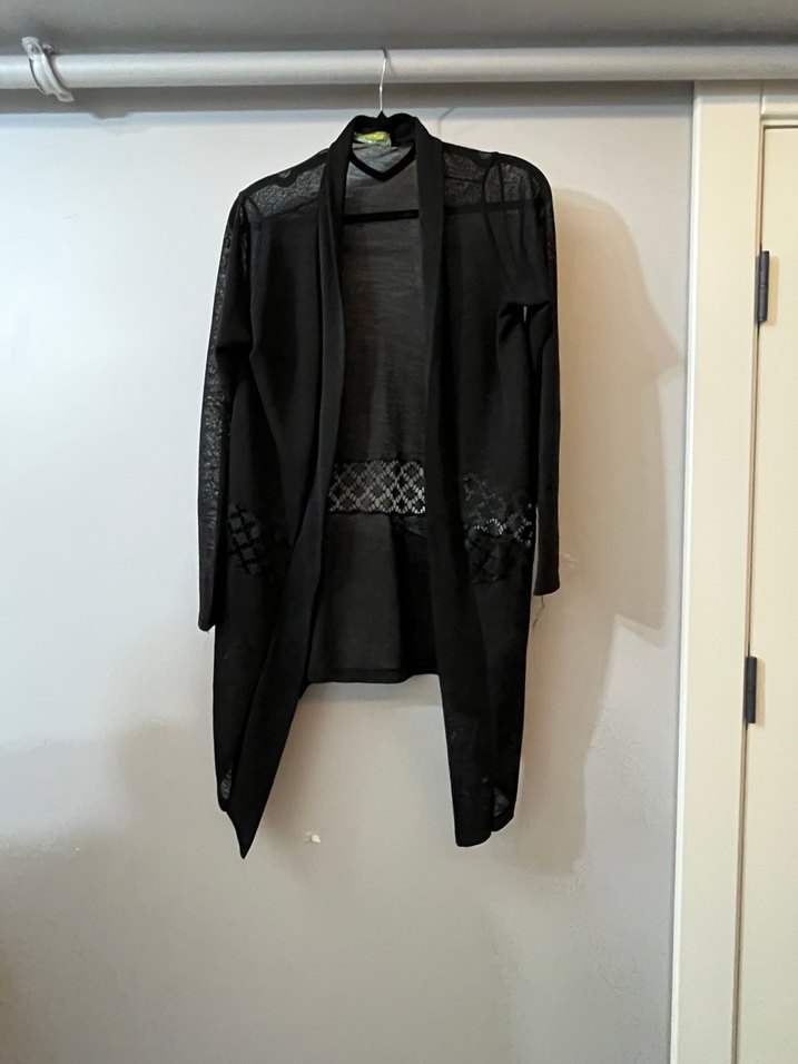 Uzun siyah goth kadın hırka, yakalı ve uzun kolludur. Sentetik kumaştan, kemerli ve günlük kullanıma uygundur.