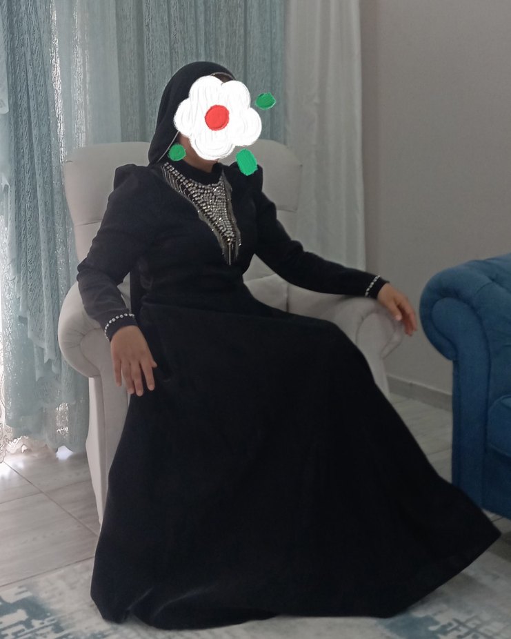 Bu siyah uzun elbise, yüksek yakalı ve uzun kolludur. Etnik desen detayları ve drapeli yapısıyla modest tarzlara uygundur ve düğünlerde tercih edilebilir.